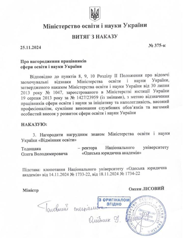 України. Наприклад, мене як ректора Академії 25 листопада 2024 року наказом