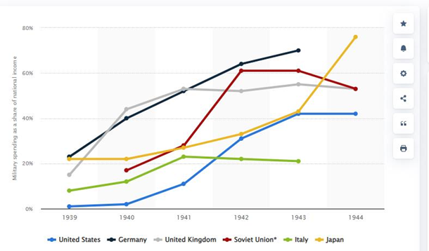 1939 to 1944, - https://www.statista.com/statistics/1333250/wwii-military-spending-share-income/?srsltid=AfmBOoowD9h4z9CHU8Kywk08JMOEZEHbME7CFnjA7epSnXz0yoWs3xTo#:~:text=Tabl
