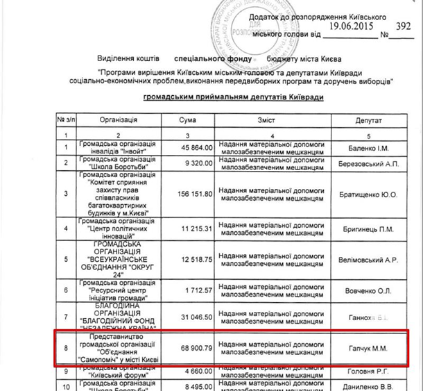 Только вот не все так просто. Так, например, из этих денег часть отправилось к Гражданской организации «Объединение «Самопомощь» в городе Киеве». Похоже, сами себе они помочь не могут – потребовались бюджетные деньги. Впрочем, в КГГА тоже их люди сидят, неудивительно, что так оперативно организовали себе «помощь».