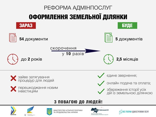 В конце 2018 года состоялось расширенное заседание рабочей группы по выработке единых подходов к развитию административных услуг в регионах, которое проходило под председательством Вице-премьер-министра - Министра регионального развития, строительства и жилищно-коммунального хозяйства Украины Геннадия Зубко. По итогам этого заседания было дано протокольное поручение Минагрополитики и Госгеокадастру вместе с Минэкономразвития и другими заинтересованными органами изучить лучший зарубежный опыт и дать наработанные предложения по сокращению сроков и процедур оформления земельного участка. Речь идет о возможности ее бесплатной приватизации, передачи в пользование или продажи из земель государственной или коммунальной собственности.