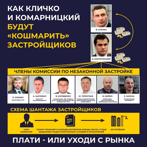 По итогу мы имеем то, что подельник мэра Кличко Комарницкий получил в свои руки Комиссию по проверке информации о резонансных объектах строительства, чтобы использовать ее для получения путем шантажа черного нала от застройщиков. И устроить полнейший беспредел на строительном рынке Киева.