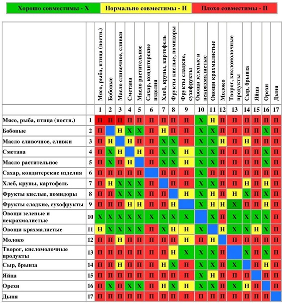 Предлагаю таблицу основных групп продуктов и их сочетаний. Лучше всего, распечатать и повесить ее на холодильнике на магнитах, и каждый раз заглядывать перед приготовлением еды! Таблица взята из открытых источников, мною дополнена и проверена на собственном, более чем пятилетнем опыте!