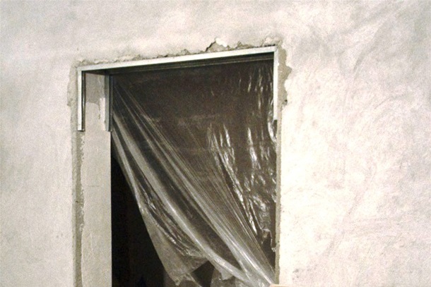 была дверь, снимаем косяк. Уровнем отмечаем вертикальные и горизонтальные