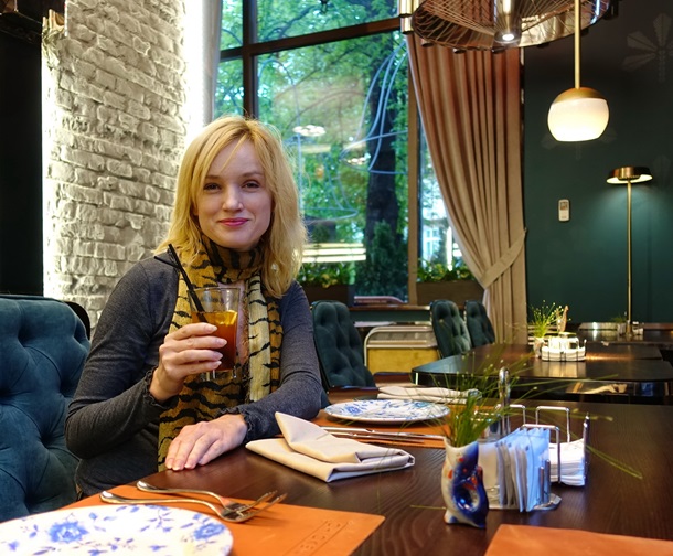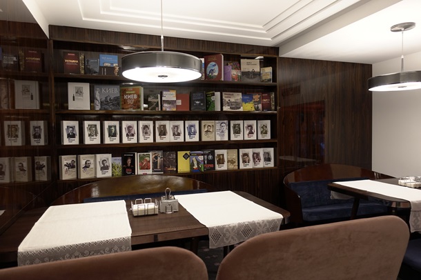 Блестящие деревянные поверхности, столы и кресла на круглых тонких ножках, чешские стенки в библиотеке, хрусталь, дефицитные по советским временам книги, серванты с высокими бокалами для гостей, торшеры, настенные лампы и официантки в передниках - все это создает у вас ощущение, что вы попали в город эпохи “Служебного романа”. Способствует этому и изумительно приготовленная котлета по-киевски, своеобразная визитная карточка заведения. В залах умиротворяюще звучит музыка украинской эстрады семидесятых.
