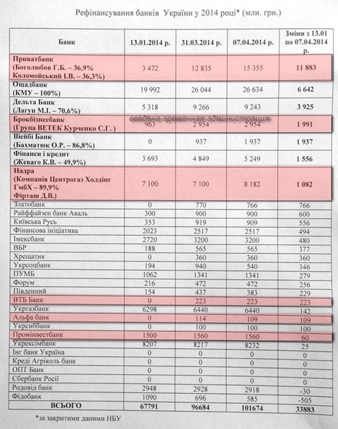предоставил трем банкам 1,2 млрд гривен рефинансирования, для поддержки их ликвидности.