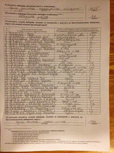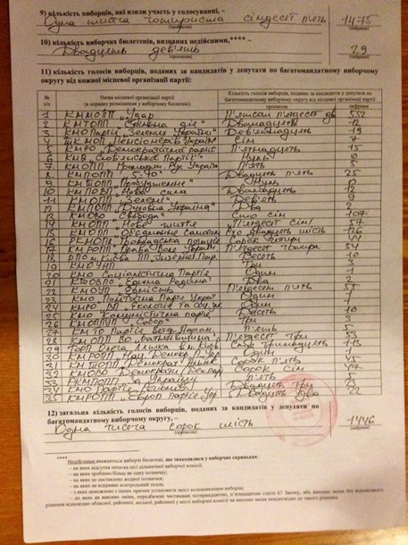 Фальсифікують по всьому Києву. Зокрема на дільниці №800379 (Дніпровський район), згідно протоколу, поданим головою дільничноі виборчої комісії (представник партії "Удар"), за Радикальну партію проголосувала аж 1 людина (!). У справжньому протоколі, який був на руках у членів комісії, за РПЛ свій голос віддали 113 чоловік. Такими нахабними фальсифікаціями займались голова комісії і секретар (дивіться фото, номер 29).