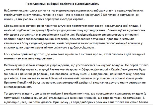 В прошлый раз это были темники по мочилову Тигипко на выборах. Вот сама «статья», которую отказались ставить несколько СМИ.