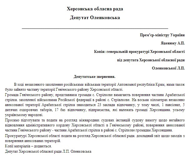 Оленковська хотіла, щоб депутати підтримали її звернення до Яценюка, щоб той подав на розгляд міжнародних судових інстанцій вимогу щодо негайного відновлення адміністративного кордону Херсонської області в Генічеському районі, повернення анексованої частини Генічеського району.