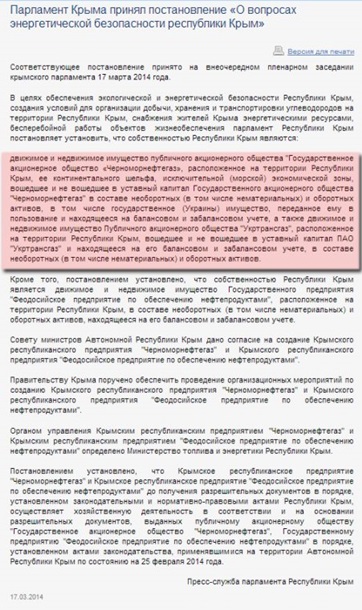 Еще в марте так называемый парламент Крыма «присвоил» республике расположенные на полуострове активы «Черноморнефтегаза» и других предприятий. В документе, принятом крымскими депутатами, говорится, что «собственностью Республики Крым являются движимое и недвижимое имущество публичного акционерного общества «Государственное акционерное общество «Черноморнефтегаз», расположенное на территории Республики Крым, ее континентального шельфа, исключительной (морской) экономической зоны».