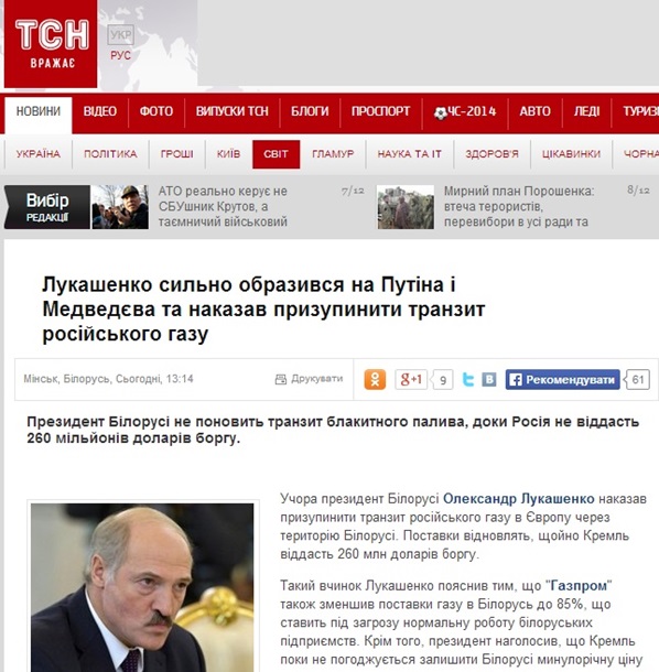 «Я приказал правительству перекрыть транзит через белорусь, пока не заплатят за транзит «Газпром». Они нам за эти погода ни копейки не заплатили. До какого цинизма можно дойти, когда ты должен мне 260 млн. долларов, я тебе – 190 млн. долларов, и ты начинаешь мне за это закручивать вентиль».
