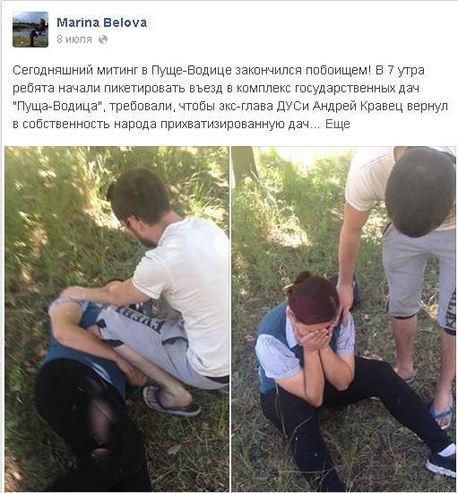 «Сегодняшний митинг в Пуще-Водице закончился побоищем! В 7 утра ребята начали пикетировать въезд в комплекс гос-ных дач «Пуща-Водица», требовали, чтобы экс-глава ДУСи Андрей Кравец вернул в собственность народа прихватизированную дачу. Через полчаса джип Кравца (тойота лэнд-крузер) пролетел на скорости и сбил девочку-активистку! Нелюди! Сколько они будут ходить по нашей земле и убивать своих граждан!», - написала Марина Белова.