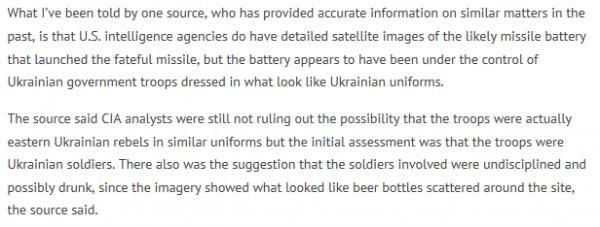 В переводе на человеческий это означает примерно следующее:"Один из источников, и ранее снабжавший меня достоверной информацией по аналогичным вопросам, сообщил, что разведывательные органы США действительно располагают подробными спутниковыми снимками ракетной системы, из которой, по всей видимости, был произведен роковой залп, однако похоже, что управляли этой системой правительственные войска Украины, одетые в нечто, похожее на военную форму украинской армии.Тот же источник заявил, аналитики ЦРУ все-таки не исключают возможности, что люди на снимках являются восточно-украинскими повстанцами в похожем обмундировании, тем не менее, по предварительным оценкам, это - военнослужащие ВС Украины. Предполагается также, что они отличались низким уровнем дисциплины и, возможно, были пьяны, о чем свидетельствуют похожие на пивные бутылки предметы, разбросанные на стартовой позиции и ясно различимые на снимках из космоса."Вот так вот, что называется, полной лопатой метнул правду ветеран американской журналистики в родной истеблишмент, и пусть теперь госдеповская Псяка оправдывается. Будет лишний повод посмеяться.А кто не верит, так вот вам ссылочка:http://consortiumnews.com/2014/07/20...ee-in-ukraine/