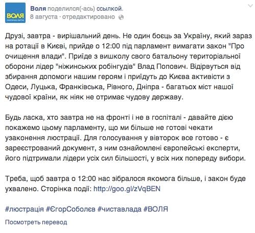 9 августа партия «ВОЛЯ» запланировала мероприятие в Киеве. Мол, жизненно важно поддержать закон об очищении власти. Необходимо прийти, иначе всему конец.