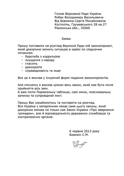 Больше года назад я отправил на имя Главы Верховной Рады свой уникальный законопроект который спасал Украину от разорения, коррупции, захвата.