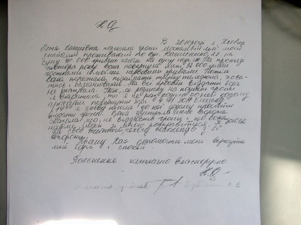 Она рассказывает о том, как одолжила деньги Москалевой и как взамен получила серию нервных срывов и угроз, расправой над ней нанятыми людьми Москалевой. Ольга Васильевна живет в страхе каждый день, боится выйти на улицу даже за продуктами.