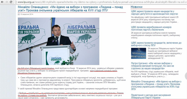 на выборы от «Либеральной партия Украины», председателем которой стал 12 июня 2014 года. И это при том, что