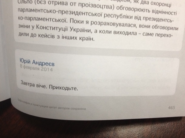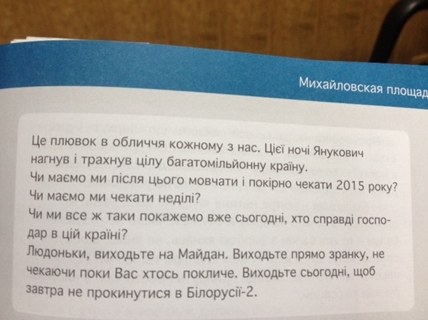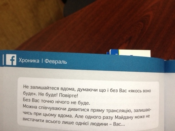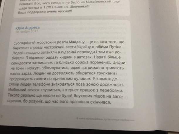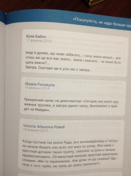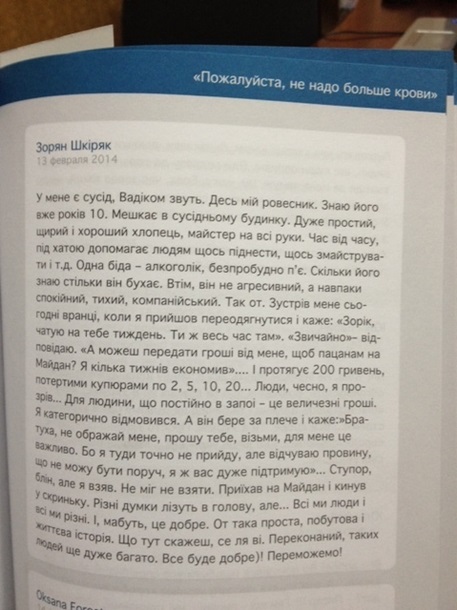 "Ця книга про звичайних людей. Про тих людей, що минулої зими, як один, плакали і мололися, говорили і кричали, йшли і бігли, несли і везли, шукали і знаходили, жартували, там де було не до сміху та сміялися попре все, просили про допомогу і допомагали. Про неймовірну єдність і величезну віру. Ця книга про незвичайних людей, які за одну зиму перетворилися в Націю.
