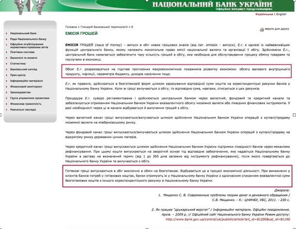 приведене в глосарії на сайті НБУ, говорить нам про те, що обсяг емісії грошей