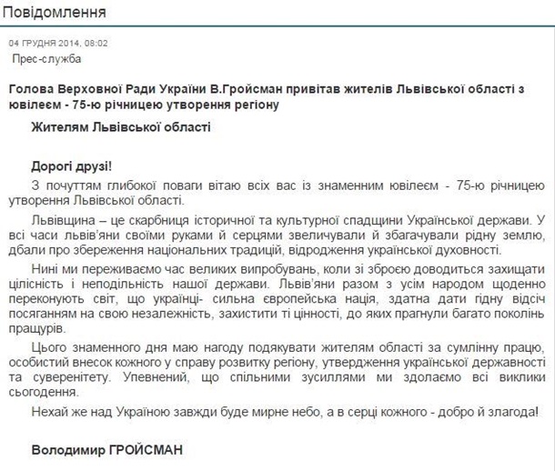 4 грудня на сайті Верховної Ради України було опубліковане Привітання Львівщини із “75-ю річницею утворення регіону” від голови парламенту Володимира Гройсмана. Як це пояснити?