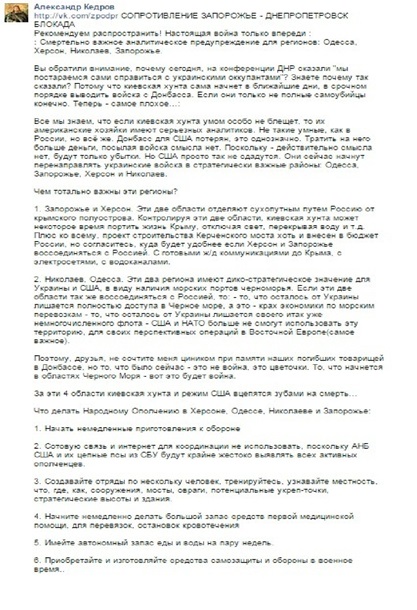 сепаратистский пост об отъединении Одессы, Николаева и других городов от Украины.