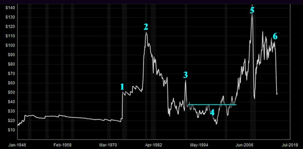 Как видим до 1973 года средняя цена на нефть колебалась в районе 25 USD за баррель, но в 1973 году она резко устремляется к отметке 51 USD! Ну конечно каждый скажет что этому причина всякие события связанные с экономическими факторами, но давайте допустим мысль что не только этот фактор влияет на цену нефти, будем смотреть на график как на историю!