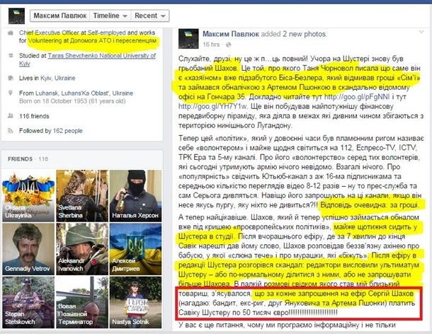 Проукраинский волонтер из Луганска Максим Павлюк сообщил вчера на своей странице в фейсбуке, что, по его данным, за приглашение на шоу Савика Шустера экс-регионал Сергей Шахов платит 50 тысяч евро.