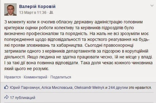 Такими діями Коровій чітко продемонстрував усім, хто намагався «пересидіти» непрості часи, втішаючи себе тим, що «вінницьких» чіпати не будуть. Поняття «вінницькі» більше немає, і новий голова ОДА закріпив за собою статус «людини Президента», для якого усі місцеві кланові традиції та норми жодного значення не мають.