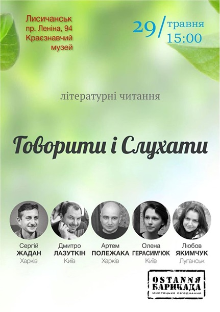 Поети Сергій Жадан, Дмитро Лазуткін, Артем Полежака, Олена Герасим'юк, Любов Якимчук у турі "Говорити і Слухати" завітають у Сватове, Лисичанськ, Старобільськ Луганської області.