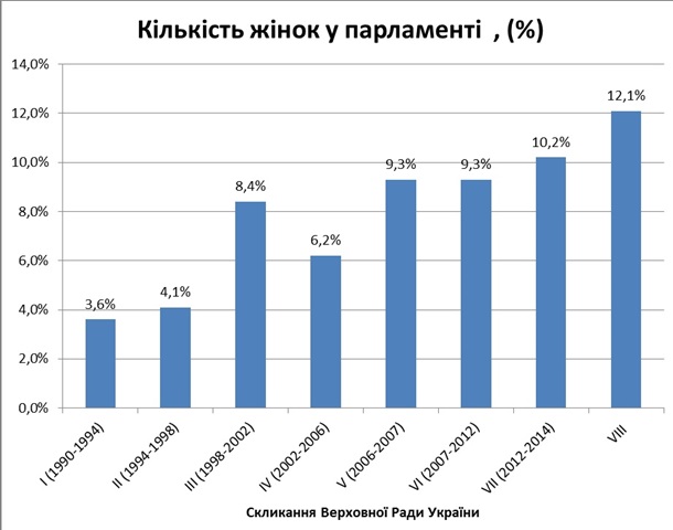 бачимо, представництво жінок у парламенті поступово збільшувалося, від 3,6% у 1990 році до 12,1% нині. Однак, за 22