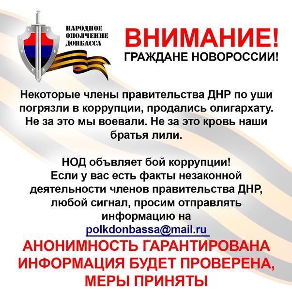 Павел Губарев, один из лидеров ДНР, решил организовать общественную организацию - НОД (Народное ополчение Донбасса) с помощью которой, под видом борьбы с коррупцией собирается искать компромат на других чиновников и руководителей региона.