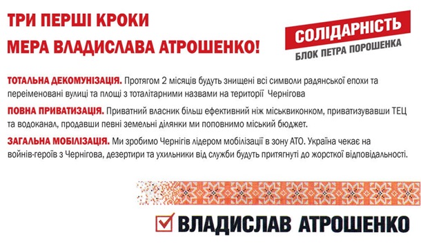 Теперь, за считанные дни до второго тура, штаб Атрошенка ищет новые возможности победы. После публикации «Трех первых шагов мэра Владислава Атрошенко», которые обещают черниговцам мобилизацию, декоммунизацию и приватизацию, становится понятным, что он рассчитывает на еще большую поддержку Гаранта. И соответственно дополнительное финансирование и лояльность милиции и работников избиркомов.