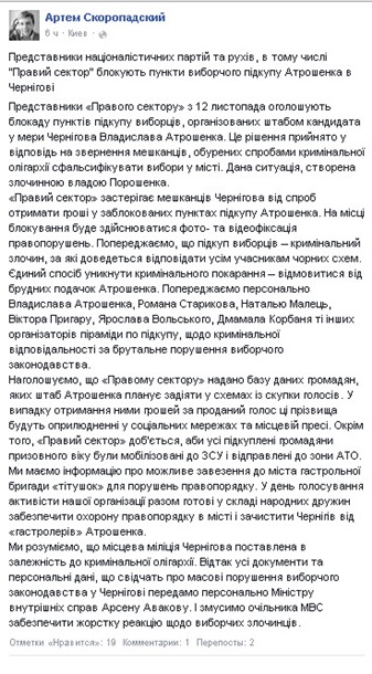Представники «Правого сектору» з 12 листопада оголошують блокаду пунктів підкупу виборців, організованих штабом кандидата у мери Чернігова Владислава Атрошенка. Це рішення прийнято у відповідь на звернення мешканців, обурених спробами кримінальної олігархії сфальсифікувати вибори у місті. Дана ситуація, створена злочинною владою Порошенка.
