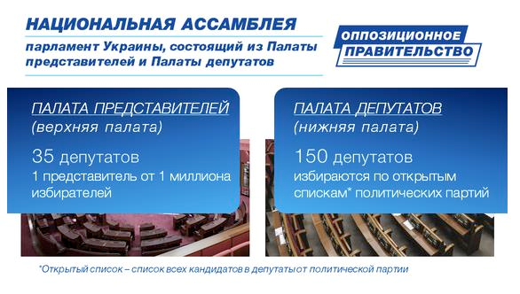 Вся полнота власти в проекте передается двухпалатному парламенту где верхняя палата состоит из 35 мажоритарных кандидатов и нижняя 150 депутатов выбраны по партийным спискам . Значительное сокращение депутатского корпуса казалось бы несомненным благом для страны, но на самом деле это лишь сокращения гарема для олигархов и соответственно расходов на его создание и содержание.