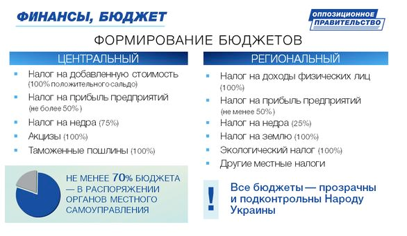 Не менее 70% бюджета должно быть в распоряжении местных советов, но это не только лишь лозунг. Схема распределения налогов между центральной и местной властью такова что для его выполнения местные налоги необходимо значительно увеличить. Если центральному бюджету передается весь НДС, половина дохода на прибыль предприятий, весь акцизный и таможенный сбор и три четверти налога на недра, а это почти все самые доходные статьи бюджета, то местные власти, что бы выполнить норму конституции, должны в разы увеличивать налоги на доходы физических лиц, налог на землю и экологический сбор, а еще придумывать новые сборы.