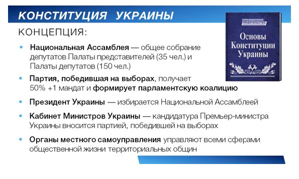 Подлинная суть их Конституции, в том что бы узаконить право олигархов забрать у общин все, Закрепить право облагать их поборами и при том сбросить с себя всякую ответственность за их выживание. С такой реформой столицу следует переносить не в Канев, а куда нибудь на Марс, что бы не тревожили почтенных господ вопли умирающих граждан. Кстати их конституция дает народу право делать предсмертный возглас на родном языке, за это право по мнению авторов проекта на верное стоит умереть без медицины, образования и социальной помощи, всем тех кто стоит сегодня на пути олигархического процветания.