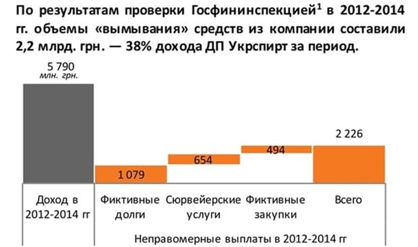 В дополнение к указанным миллиардам, налоговая служба выставила госмонополии штрафов на без малого два миллиарда гривен за нарушения порядка перемещения спирта в период 2012–2014 годов. По сути, это прямое обвинение в производстве и продаже теневого спирта.
