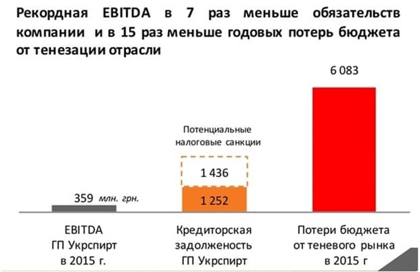 Резюмируя кратко: в 2015 год государственная спиртовая монополия вошла, имея кредиторской задолженности на полтора миллиарда гривен, с налоговыми претензиями на два миллиарда и с практикой воровства до 40% от оборота компании.И начался второй период – "потемкинские деревни". Нет, в самом этом термине нет ничего плохого, ведь по легенде князь просто хотел несколько приукрасить действительность на скорую руку, не имея возможности и времени сделать хорошо на самом деле. Вот и в "Укрспирте" по-быстрому навели "порядок": перестали платить на фирмы-однодневки и повысили отпускные цены на 30% (ведь это же монополия, а покупатель, то есть мы с вами, никуда не денется). В результате "Укрспирт" публично демонстрирует рекордную в своей истории прибыль до налогообложения (EBITDA) – 350 млн грн! Но посмотрим на этот выдающийся финансовый результат попристальней: куда он делся, и много ли это на самом деле?После уплаты налогов от 350 миллионов осталось лишь 16… Вся рекордная прибыль ушла на погашение налоговых штрафов (помните про два миллиарда?) и кредиторской задолженности. И здесь возникают неприятные вопросы. Согласно акта проверки Госфининспекции, отчетность ГП "Укрспирт" как только не терялась: дважды ее похищали из автомобилей аудиторов, один раз - даже вместе с машиной. Потом же, то, что осталось, ухитрилось сгореть в Доме профсоюзов во время Революции Достоинства, там дескать арендовали комнатенку под архив, хотя офис "Укрспирта" – целое здание напротив через площадь, и к профсоюзам не имеет никакого отношения. В компании до сих пор нет системы "1С", а нынешний менеджмент уже рапортует о переходе на облачные технологии – но это его нормальное неземное состояние: несмотря на все реляции, "Укрспирт" до сих пор даже не зарегистрирован в системе ProZorro!Итак, неприятный вопрос: при очевидном воровстве из госпредприятия, как мы знаем, до 40% от оборота, логично предположить, что значительная часть текущей кредиторской задолженности (в полтора миллиарда гривен) также является фиктивной или просроченной. И финансовые аналитики в отрасли, и эксперты солидного отечественного инвестбанка сходятся в оценках, что до 75% от кредиторки могут быть списаны при аудите. Тем не менее, менеджмент так и не провел этот аудит, но предпочел погашать эту кредиторку живыми деньгами. На это и ушла львиная часть рекордной прибыли, полученной, как мы помним, за счет повышения отпускных цен на треть.Грустно осознавать, что рекордная прибыль компании не попала в бюджетный карман государства, не пошла на социальные выплаты персоналу, или хотя бы перевооружение и модернизацию спиртзаводов. Но еще печальнее становится, если сравнить эту рекордную прибыль с текущими долгами предприятия – они превышают эту прибыль в 7 раз. Нам нужно 7!!! лет, чтобы просто выбраться из долговой ямы.Но и это не главное, и это, к сожалению, основная проблема нынешнего руководства госпредприятия – оно не понимает, в чем ключевая проблема отрасли, и на что нужно направить все свои усилия, вместо ухода на "заоблачный уровень. Сейчас оно готовится повторить простенький трюк своих предшественников – повысить отпускные цены еще на 20%, а там и до очередной рекордной прибыли рукой подать.А главное здесь - это потери бюджета от тенизации отрасли, которые в прошлом году составили 6 миллиардов гривен!!! Убытки, недополуче