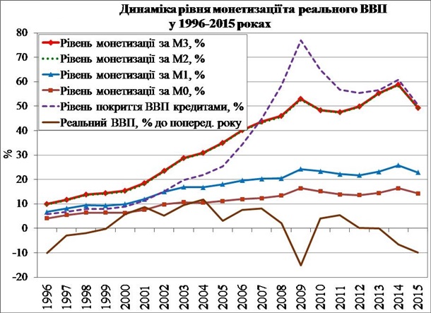 Падіння рівня монетизації за усіма грошовими агрегатами (відношення грошових агрегатів до номінального ВВП) відбулося навіть в умовах падіння цього самого реального валового виробництва. Рівень монетизації за М3 у 2015 р. скоротився майже на 10 п.п. — до 49%.