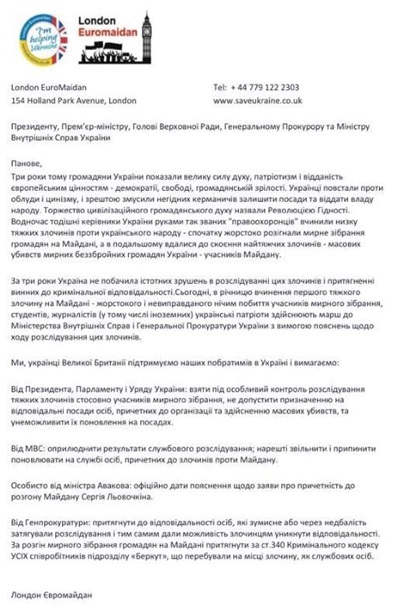 Водночас у Лондоні представники НГО "Лондон-Євромайдан" на підтримку смолоскипної ходи пройшлися до посольства України та передали послу аналогічне Звернення від української діаспори Великобританії.