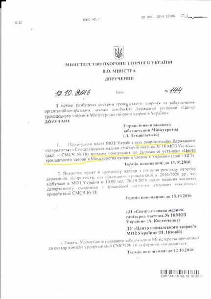 Поручение от 12 октября 2016 года за № 144 и гласит следующее: с целью системы общественного здоровья и организационно-правовых мероприятий деятельности госучреждения «Центра общественного здоровья МОЗ Украины»