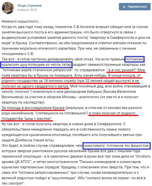 Стрелков: «а я что, рыжий? Мне тоже квартира бы в Крыму не помешала. Хоть какая-нибудь. В конце концов»....