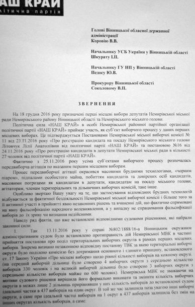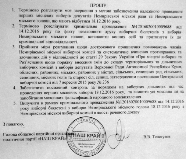 В облорганизации партии «Наш край» обратились к председателю ОГА Коровию и руководителям силовых структур с описанием событий, происходивших в Немировской избирательной комиссии. Партийцы отмечают, что сначала по инициативе главы избиркома В. Мировского было принято совершенно необоснованное решение о печатании бюллетеней в ЧАО «Винницкая облтипография». Причем, вопрос решился без обсуждения и голосования.