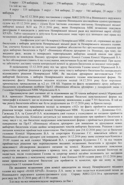 Кандидат от «Нашего края» Л. Литовчук обратилась в Винницкий окружной админсуд с исковым заявлением о незаконности действий избиркома. Слушание назначают на утро 16 декабря, потом переносят на следующий день, и в итоге 17-го иск оставляют без рассмотрения. В самом Немирове бюллетени уже раздали по участкам. По неофициальным сведениям, аналогичное заявление в суд собираются вскоре подать и в штабе кандидата от БПП М. Зазуляка.