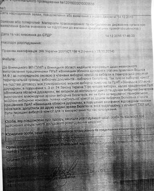 Затем, 13 декабря, Мировский самостоятельно принял решение о замене текста бюллетеня, и типография отпечатала 7 301 бюллетень для выборов мэра, который, как считают партийцы, не отвечает нормам законодательства. По факту незаконной печати 14 декабря следователь Винницкого отдела полиции открыл уголовное производство по части 2 статьи 158 УК Украины.