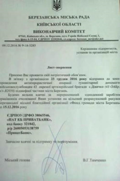 матеріальне забезпечення військовиків. Та й у листі-зверненні міського голови