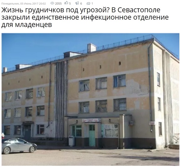 больницы №5 (http://obyektiv.press/novosti/zhizn-grudnichkov-pod-ugrozoj-v-sevastopole-zakryli-edinstvennoe-infektsionnoe-otdelenie-dlya-mladentsev).