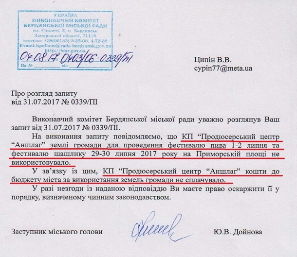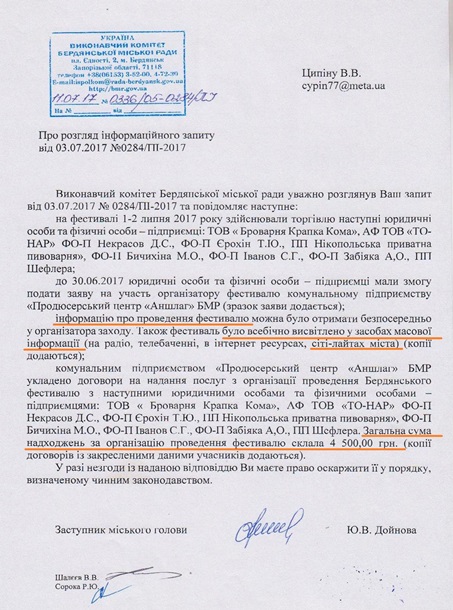 подтверждает письмо заместителя городского головы Ю. Дойновой.