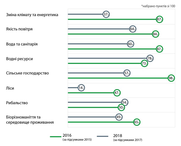 Якщо говорити більш детально про Україну, спостерігається динаміка падіння всіх груп показників за виключенням водних ресурсів та рибальства. Україна втратила 49,9 пунктів за показником зміни клімату та енергетики. Цей показник демонструє значне збільшення рівня інтенсивності викидів вуглецю на одиницю ВВП. За показником якості повітря та рівня його забруднення небезпечними речовинами Україна втратила 20 пунктів, 26,3 пункти - в категорії якості води та санітарії, 33 пункти - в категорії ліси і 16,5 пунктів - в категорії охорона природи та біологічного різноманіття. Все це говорить про значний крок України назад та неефективну екологічну політику.