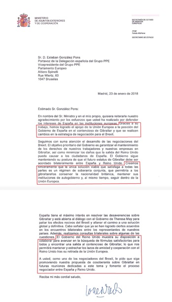 "Прошу Вас, як безпосереднього учасника переговорів, і в подальшому просувати наші пропозиції про спільний суверенітет на засіданнях, присвячених Брекзіту, а також посприяти проведенню успішного переговорного процесу щодо Гібралтару між Іспанією та Сполученим Королівством".
