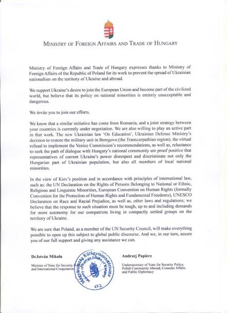 Будапешт знову виявився неоригінальним в своїх вимогах: надумані претензії до закону "Про освіту", невдоволення наміром Міноборони відновити військову базу і розмістити 800 військовослужбовців в Береговому, а також докір з приводу відсутності діалогу влади з угорською національною громадою. З боку Іштвана Миколи подібні листи до поляків - справжня підлість на тлі того, як Нацполіція посилила охорону угорських консульств і патрулювання вулиць для забезпечення безпеки закарпатських угорців, які вирішили проголосувати на угорських парламентських виборах. До речі, горезвісний закон "Про освіту" дозволить місцевим угорцям, нарешті, вивчити українську мову і скласти ЗНО, що відкриє угорцям шлях в кращі виші України і в подальшому дасть їм можливість соціалізуватися, отримавши високооплачувану роботу. У свою чергу, рідкісні конфлікти і інциденти українських патріотів з угорськими організаціями, перш за все, пов'язані з підтримкою з боку офіційної влади Угорщини радикалів і екстремістів, які своїми провокаціями стравлюють українців і угорців в Закарпатті. По суті, Будапешт намагається приписати погляди радикальних угорських націоналістів звичайним угорцям, які не відчувають ніякого утиску в Закарпатті та ніяк не обмежені ні в розвитку своєї культури, ні в зв'язках з Угорщиною. Бажання угорців через Польщу підняти на Радбезі ООН питання про надання широкої автономії національній громаді в Закарпатті навпаки погіршить ситуацію і неминуче спровокує зростання напруженості в регіоні.
